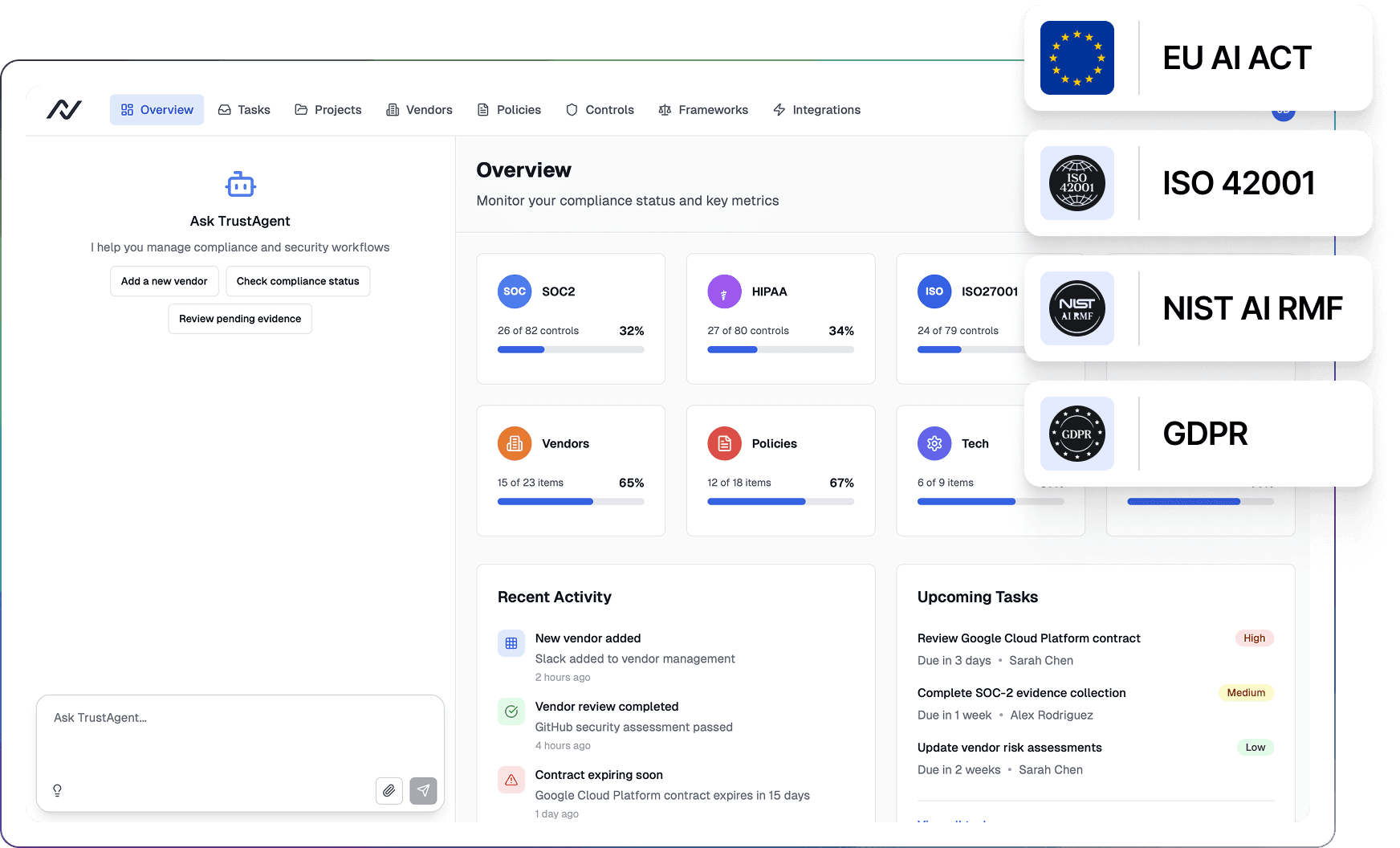 We support the EU AI Act, NIST AI RMF, ISO 42001, OWASP LLM Top 10, and MITRE ATLAS — with built-in templates and mappings for each. Custom frameworks can also be added.